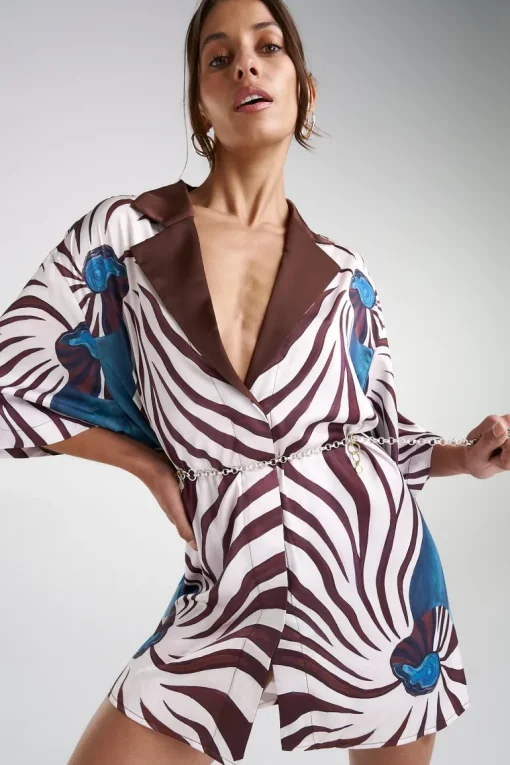 Embrace versatility with the Luka Shirt Dress – Nautilus. This hand-painted print is framed by a bold, oversized collar and can be worn as both a shirt and a dress. The concealed buttons at the front add a touch of elegance to this must-have piece.