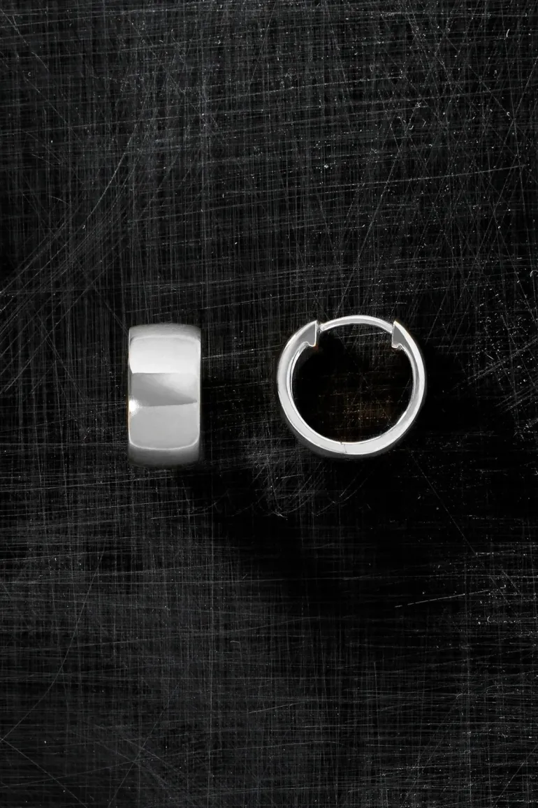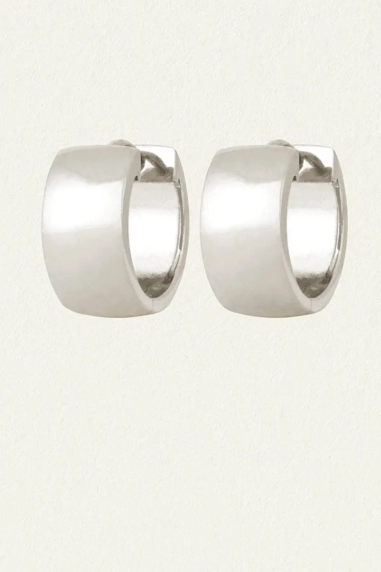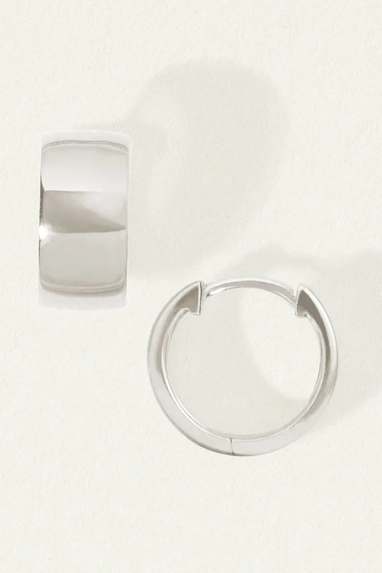 Bold and contemporary, the recycled sterling silver Nyla Hoops are wide huggies with a polished finish, perfect for sculptural stacking.