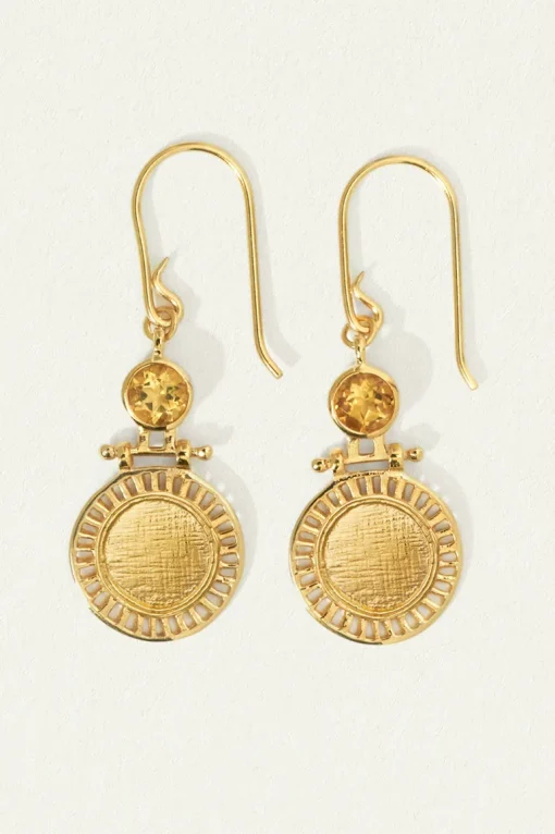 Experience the radiant beauty of Solar Earrings, handmade with 18k gold vermeil. These striking earrings showcase sun disc drops adorned with sparkling citrine gemstones that catch and reflect the sun’s rays.