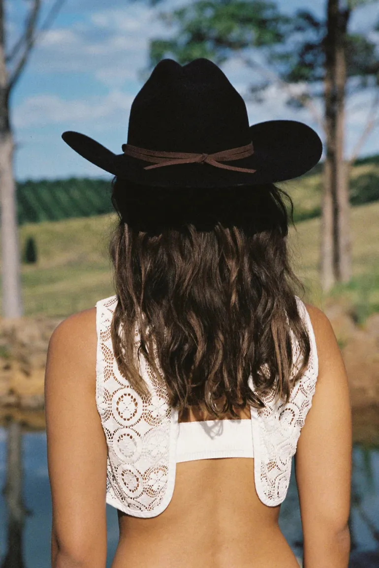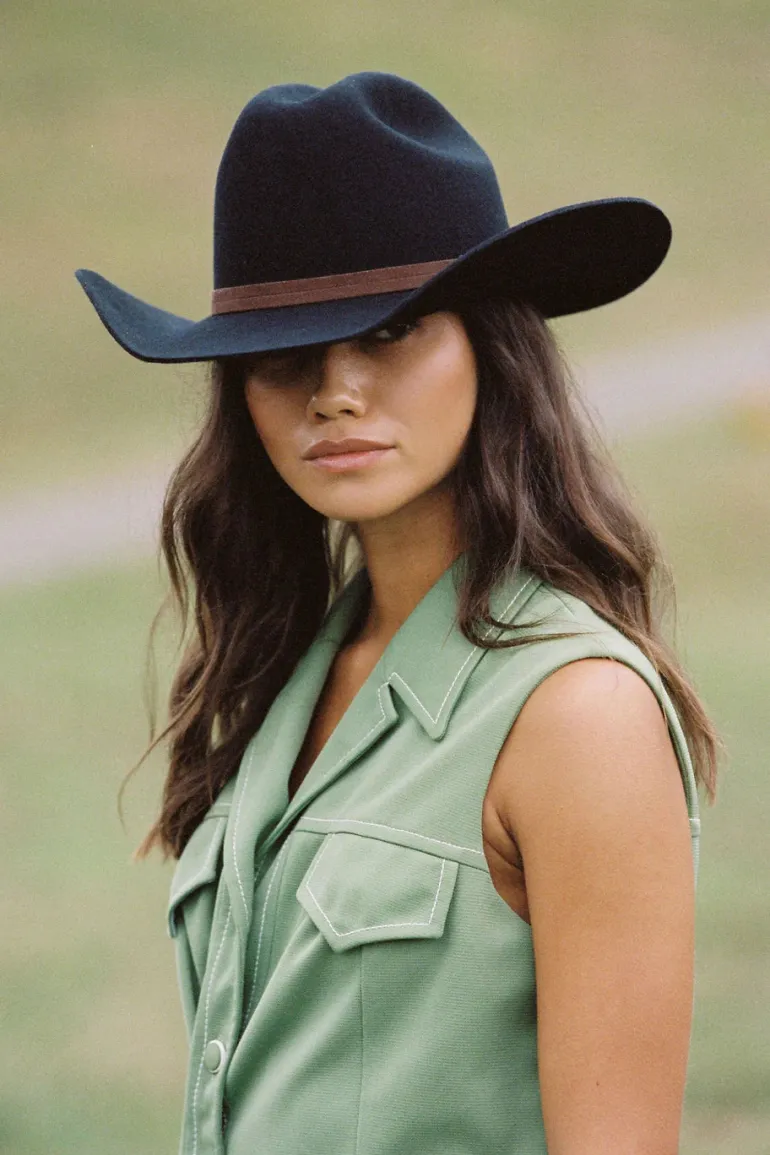 Experience the carefree days under the sun or stars with the Wilder Cowboy – Black. With its sleek silhouette and angled brim, this hat will become your go-to companion for all of your adventures.